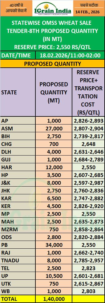 STATEWISE OMSS WHEAT SALE TENDER-8TH PROPOSED QUANTITY