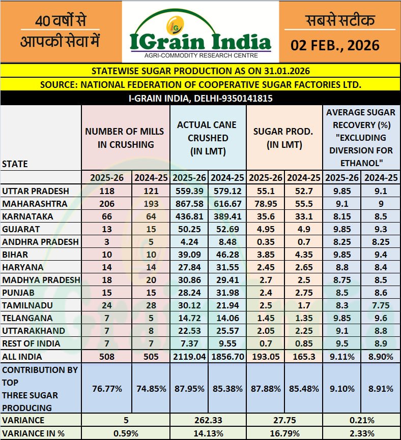 STATEWISE SUGAR PRODUCTION AS ON 31.01.2026