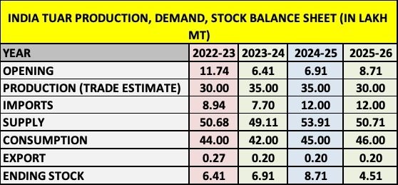 भारत तुअर (अरहर) उत्पादन, मांग और भंडार स्थिति रिपोर्ट 2025-26