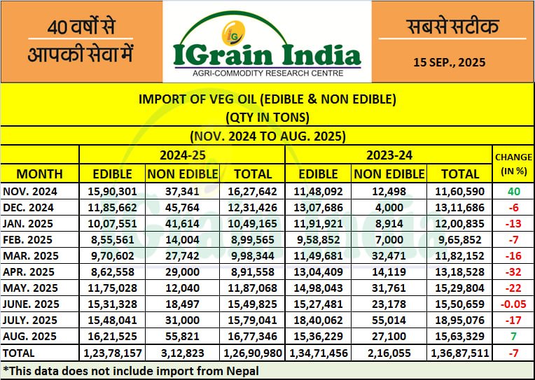 Vegetable Oil Imports – Down 7% between November 2024 and August 2025: SEA