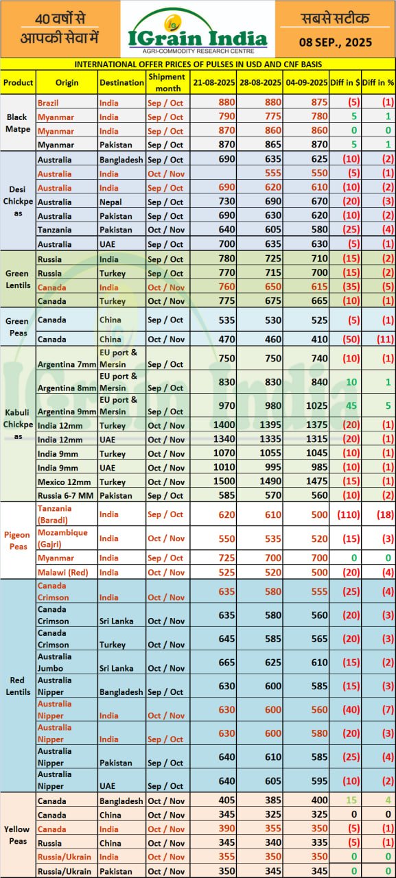 INTERNATIONAL OFFER PRICES OF PULSES IN USD AND CNF BASIS