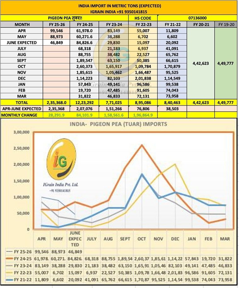 ★ In the April–June quarter of FY 2025–26, India’s estimated total pigeon pea import is expected to be 235,368 metric tons, compared to 207,076 metric tons during the same period in FY 2024–25 – an increase of 28,291 tons.