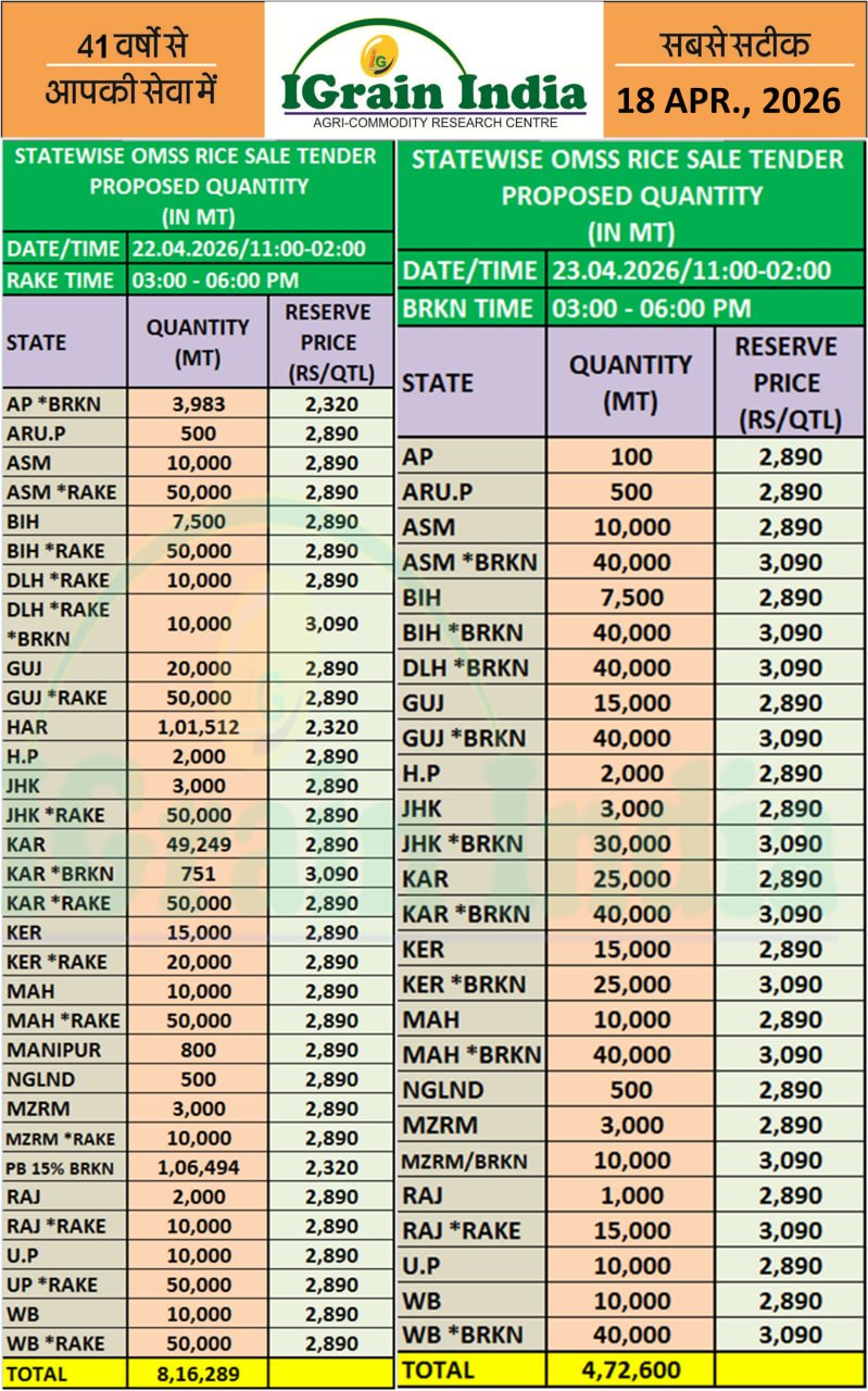STATEWISE OMSS RICE SALE TENDER PROPOSED QUANTITY